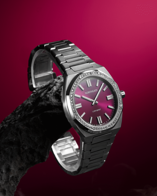 • Dial-matching shiny cherry silicone quick-release strap with steel buckle