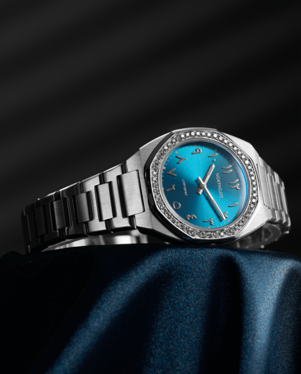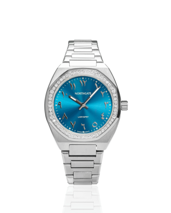 • Silver Sky Blue plated (DLC) integrated bracelet with butterfly clasp (special Northgate tool and extra links included for easy adjustment)