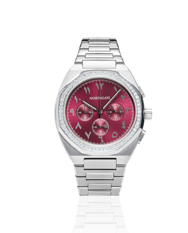 * Shiny Cherry Red dial with diamond-cut hands and applied markers