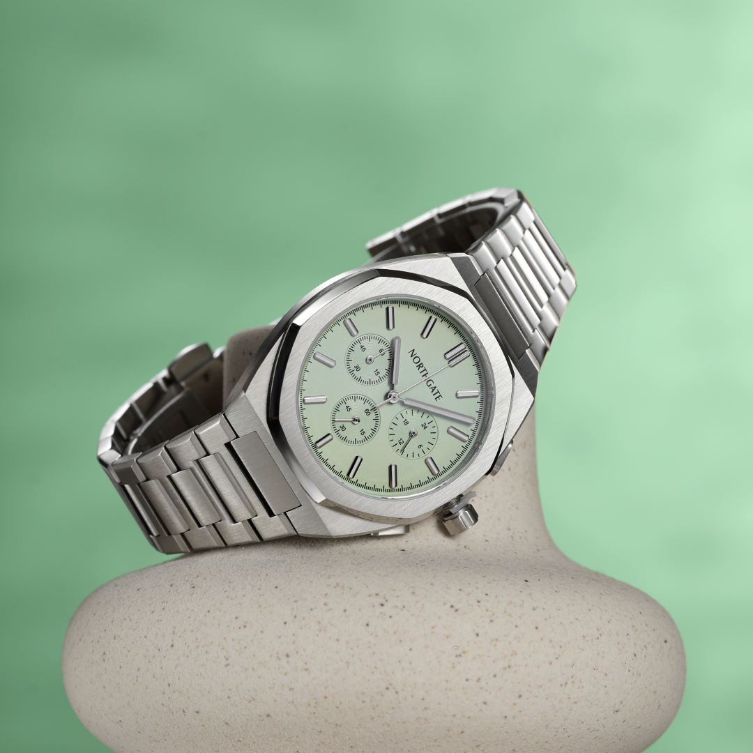 * Stainless Steel silver plated integrated bracelet with butterfly clasp (We added a special Northgate tool and extra links for easy adjustment of the bracelet)