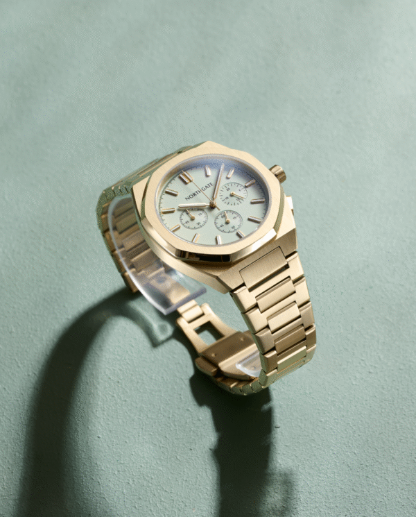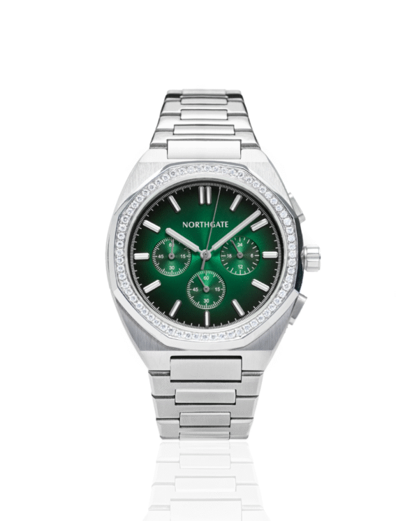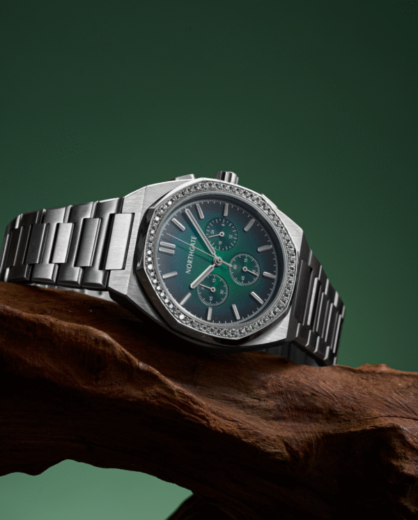 • Dial-matching Vasper Green silicone quick-release strap with steel buckle