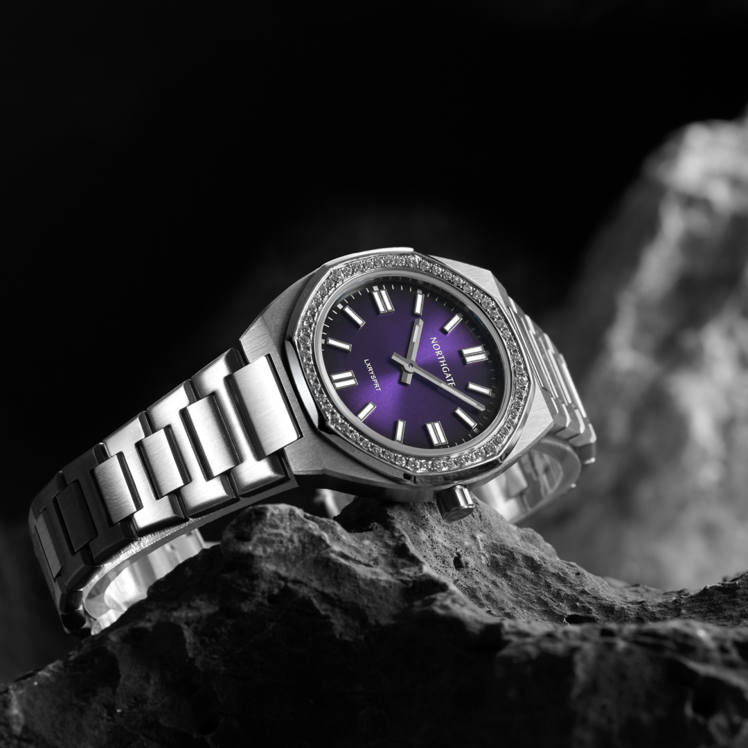 • Dark purple dial, diamond-cut hands and markers