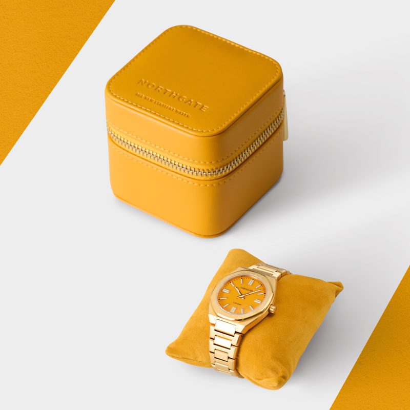 – Stainless Steel Yellow Gold plated integrated bracelet with butterfly clasp (We added a special Northgate tool and extra links for easy adjustment of the bracelet)
